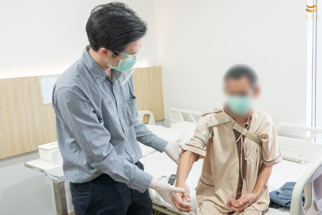 นพ.กฤษณะ เกียรติโชควิวัฒน์ แพทย์เฉพาะทางด้านเวชศาสตร์ฟื้นฟู เข้าตรวจเยี่ยมอาการผู้เข้ารับบริการ ณ ศูนย์ KIN - Rehabilitation & Homecare